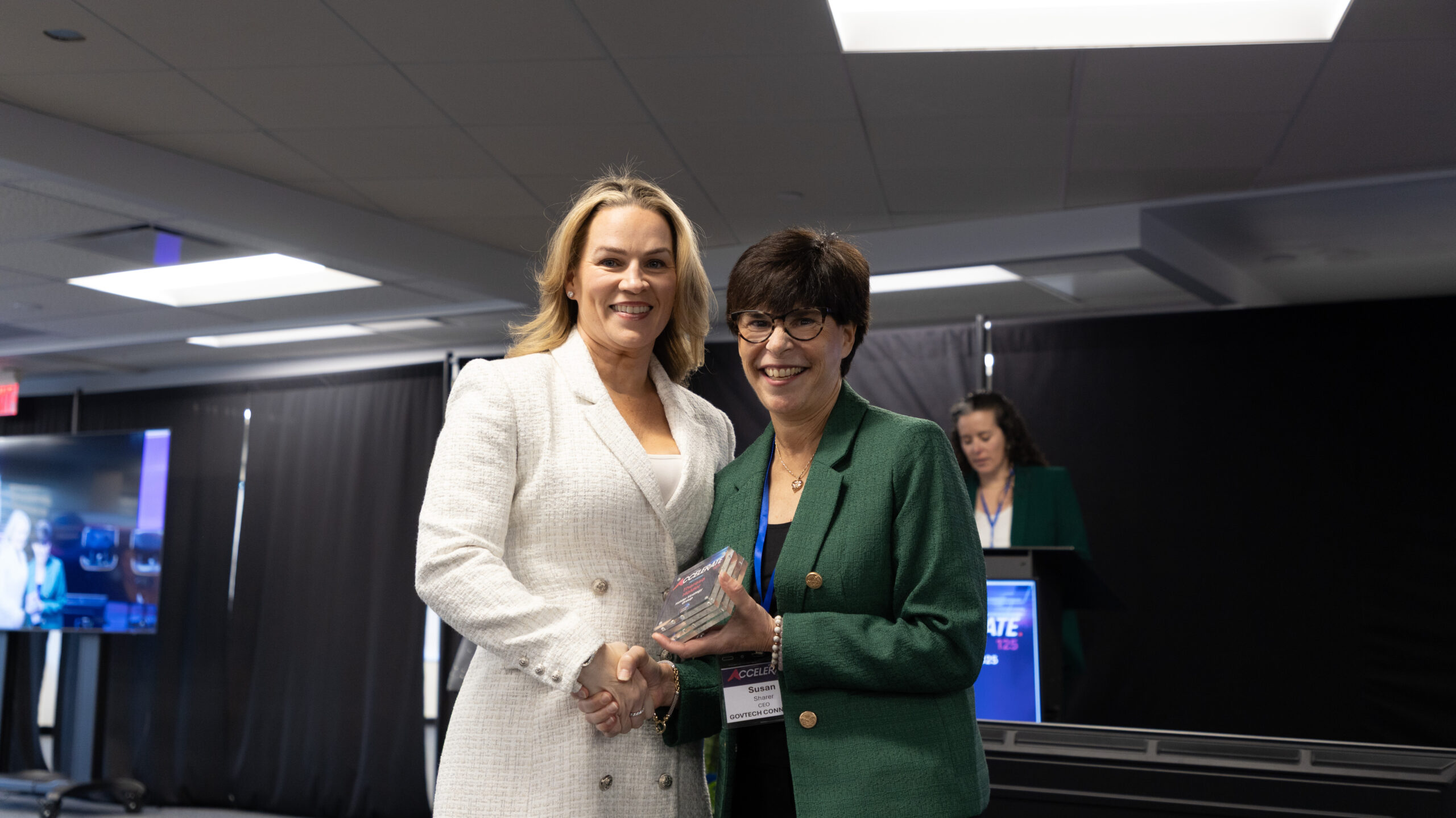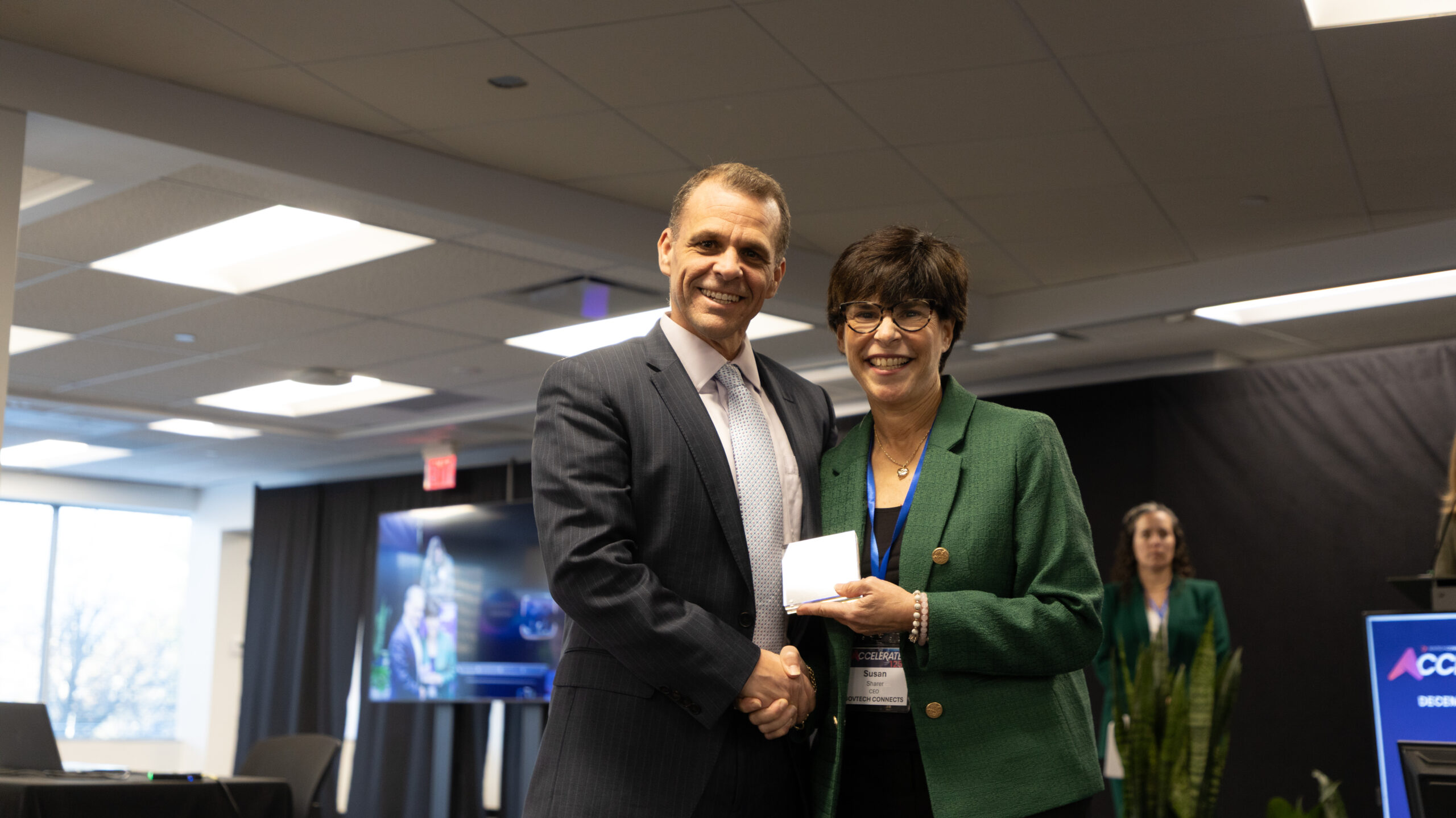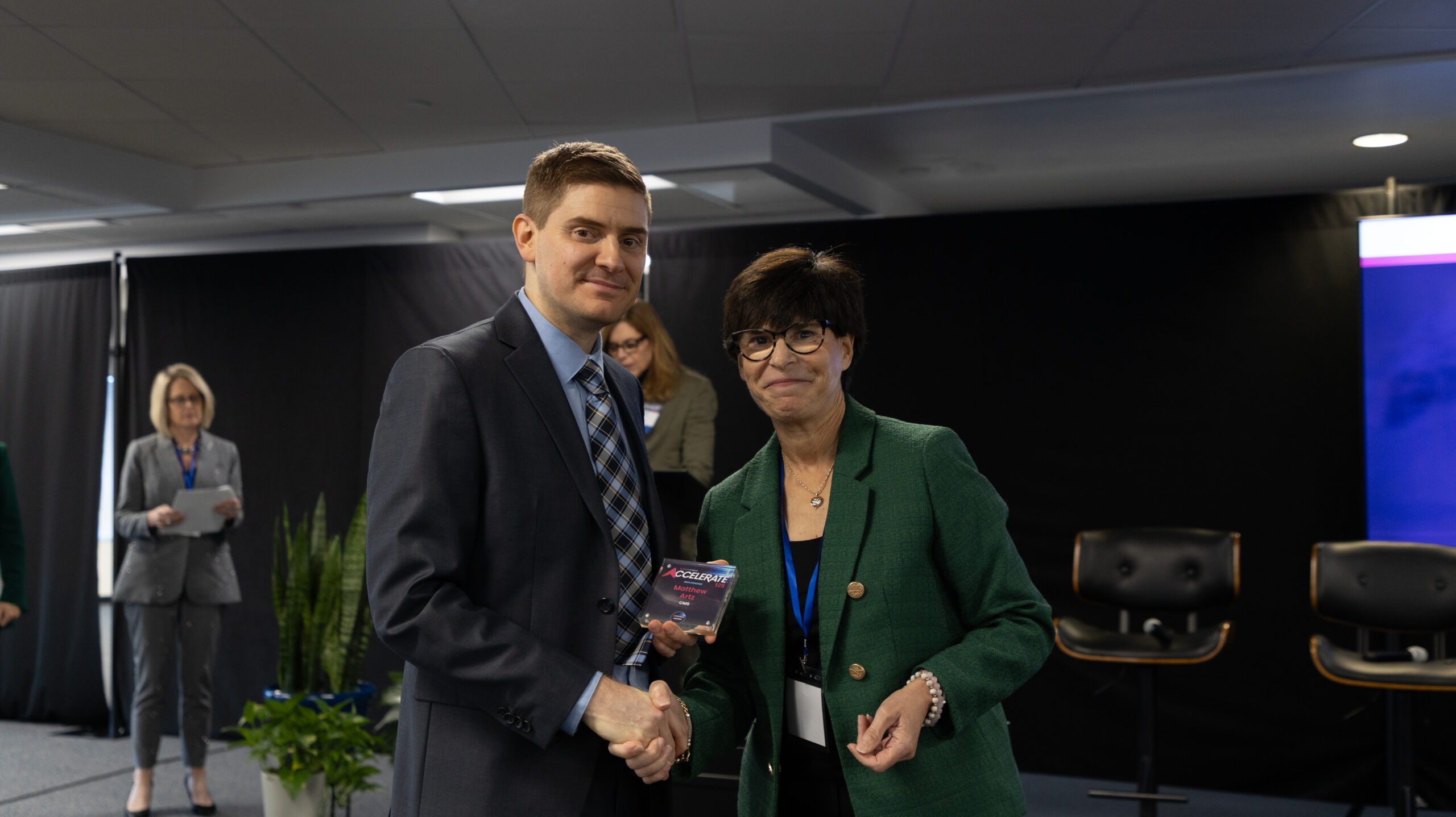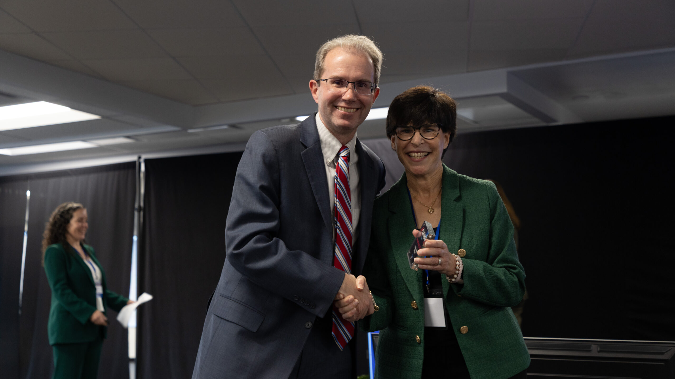 A man and a woman shake hands on a stage