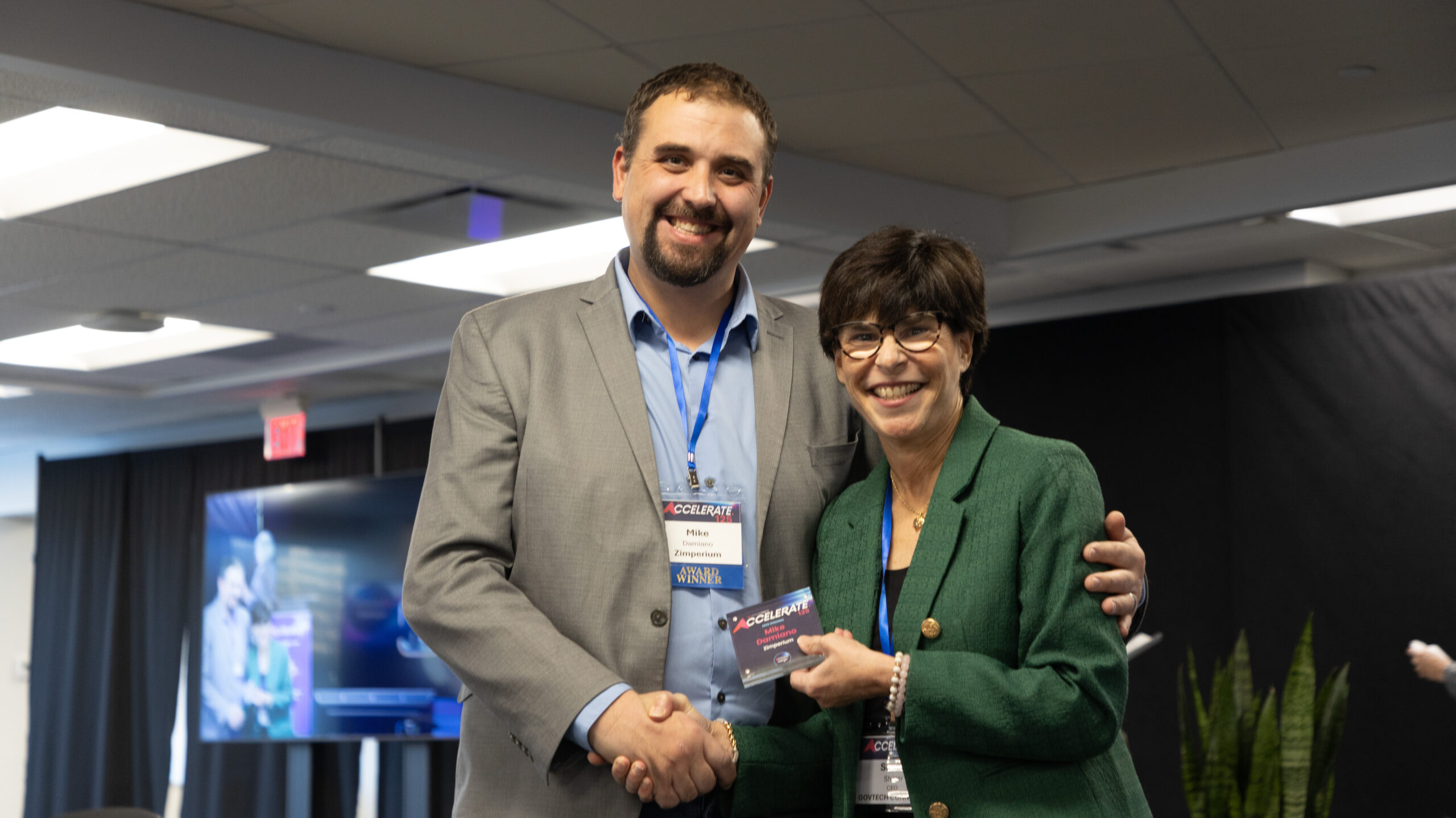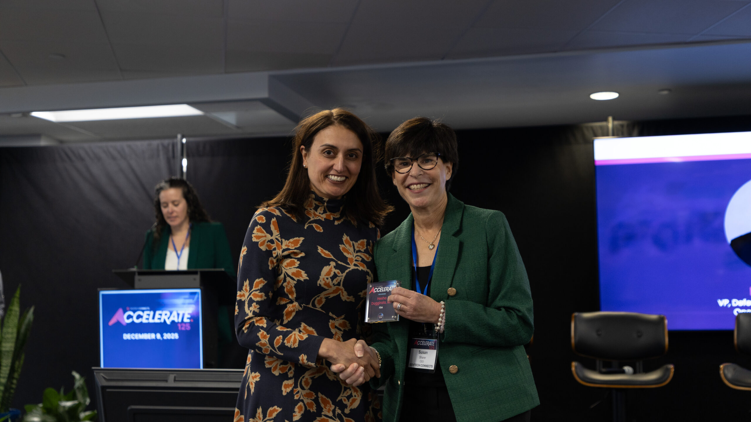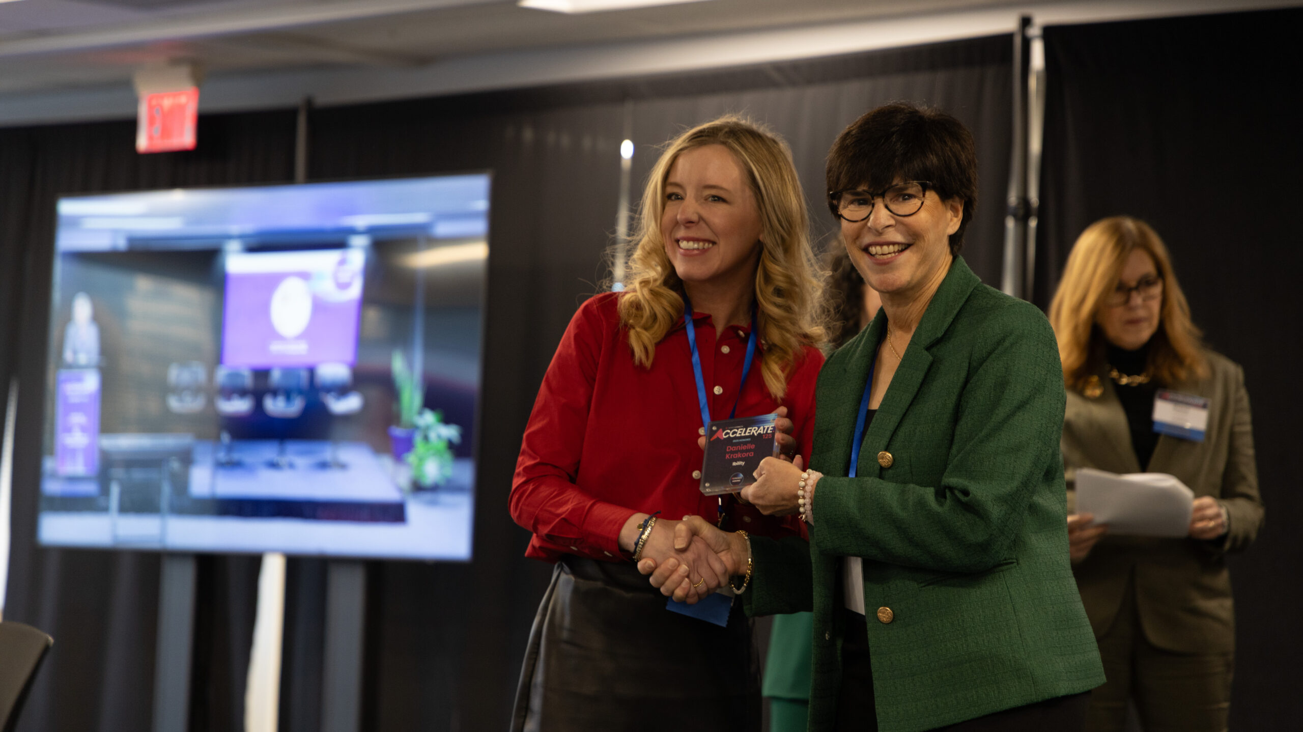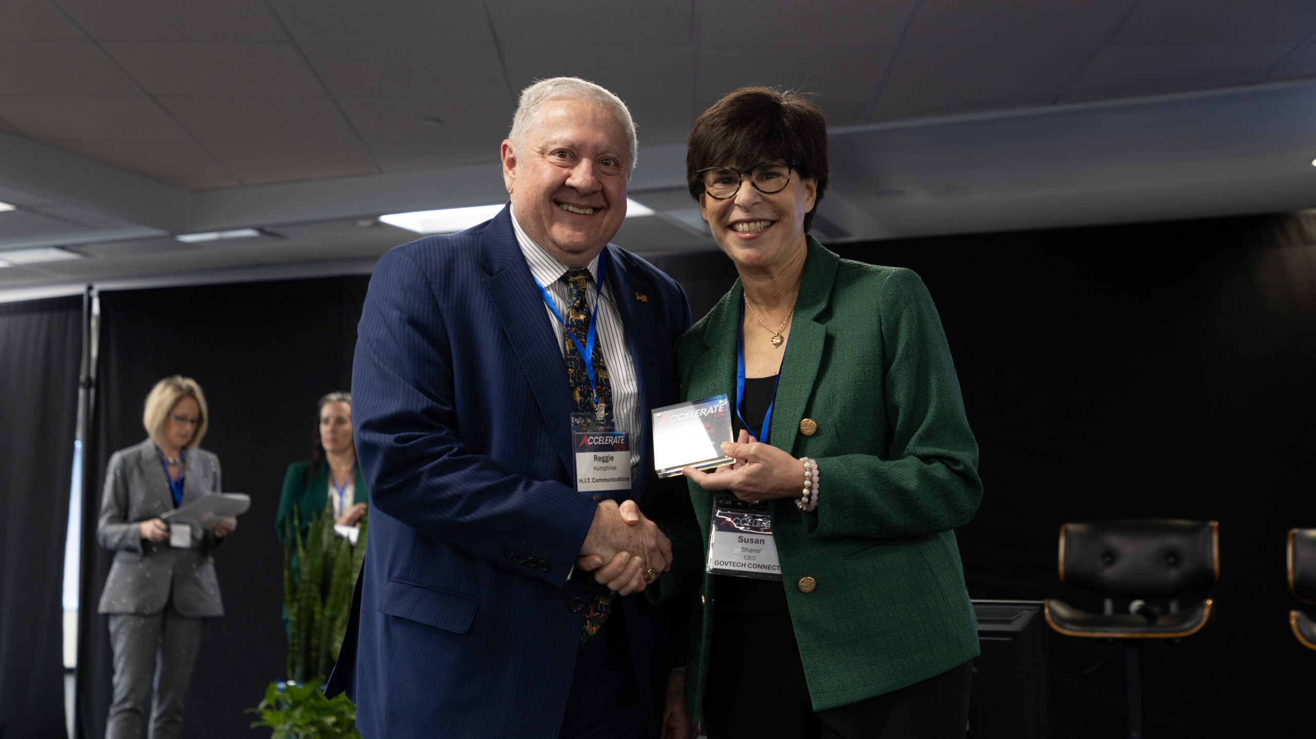 A man and a woman shake hands on a stage